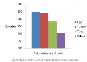 Die Insulinantwort wurde mit der Appetitunterdrückung in Verbindung gebracht. Fakt ist, die Wheyprotein Gruppe hatte die größte Insulinausschüttung und den größten Effekt auf die Sättigung. In der folgenden Grafik sehen wir die Kalorienaufnahme beim Mittagessen, 4 Stunden nach dem der Shake getrunken wurde. Die Molkenproteinshake Probanden aßen im Schnitt 150kcal weniger als die Eier und Geflügelgruppe. Auch hier gab es eine hohe Korrelation zwischen der Insulinantwort und dem Hungergefühl, die Gruppe mit der höchsten Insulinantwort aß am wenigsten und die Gruppe mit den niedrigsten Insulinanstieg aß am meisten.